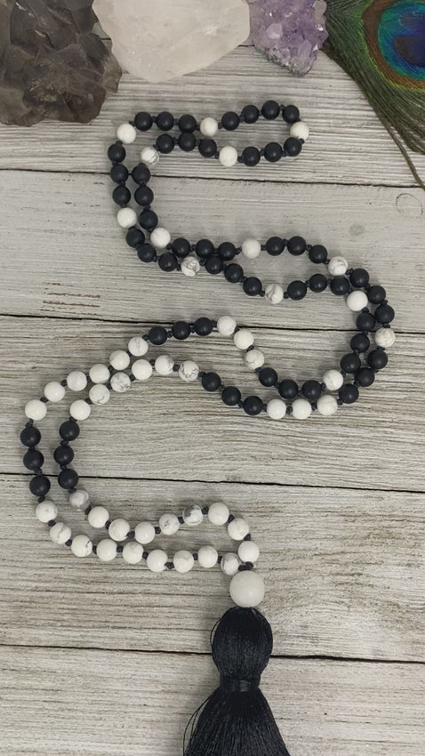 Experience the perfect balance of tranquility and protection with this stunning 108-bead mala, thoughtfully crafted with the harmonious energies of Howlite and Black Onyx.